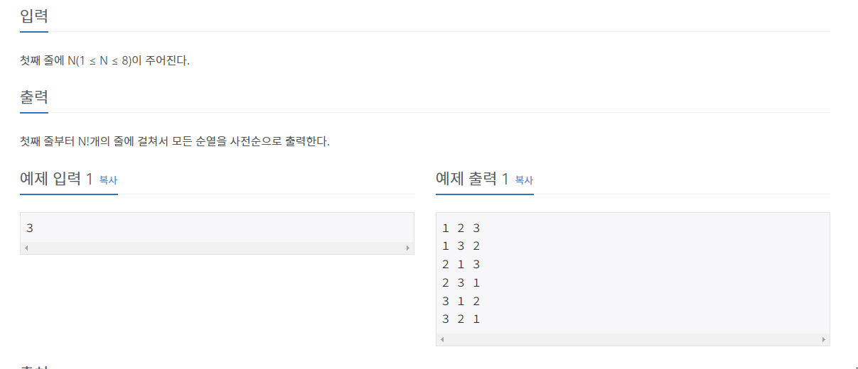백준 10974 모든 순열 문제입니다. 말그대로 모든 순열(permutations)을 출력하는 문제였습니다. 실버 3의 난이도라고 하지만 파이썬으로 풀면 브론즈 3정도 되는 것 같습니다.