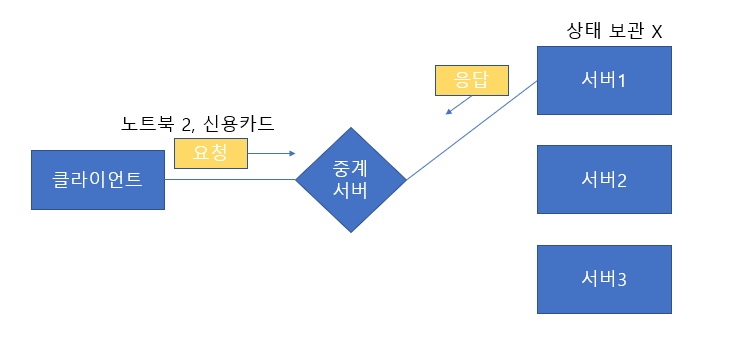 - 중간에 다른 점원을 바뀌어도 된다. 갑자기 고객이 증가해도 점원을 대거 투입 가능하고, 이는 클라이언트 요청이 많아져도 서버를 대거 투입이 가능하다는 뜻이다.